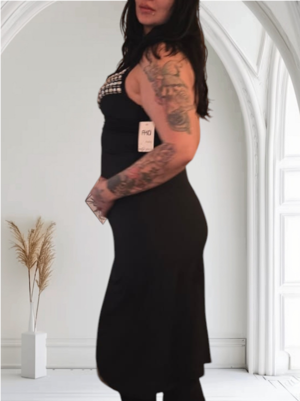 zeer fijne zwarte lange jurk met palleten de stof past zich aan het lichaam one size